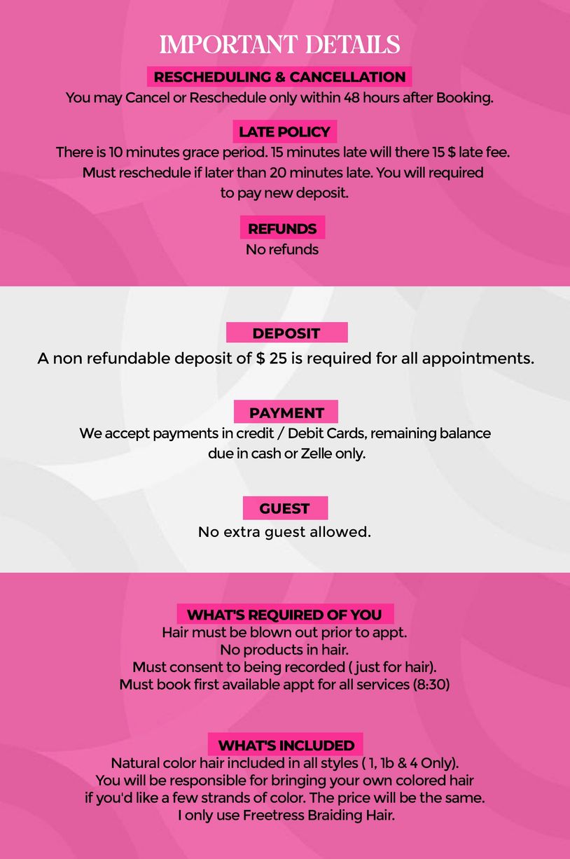 Cancellations accepted up to 24 hours before the scheduled service. Within 24 hours of the service, cancellations will be charged 50% of the scheduled cost.
